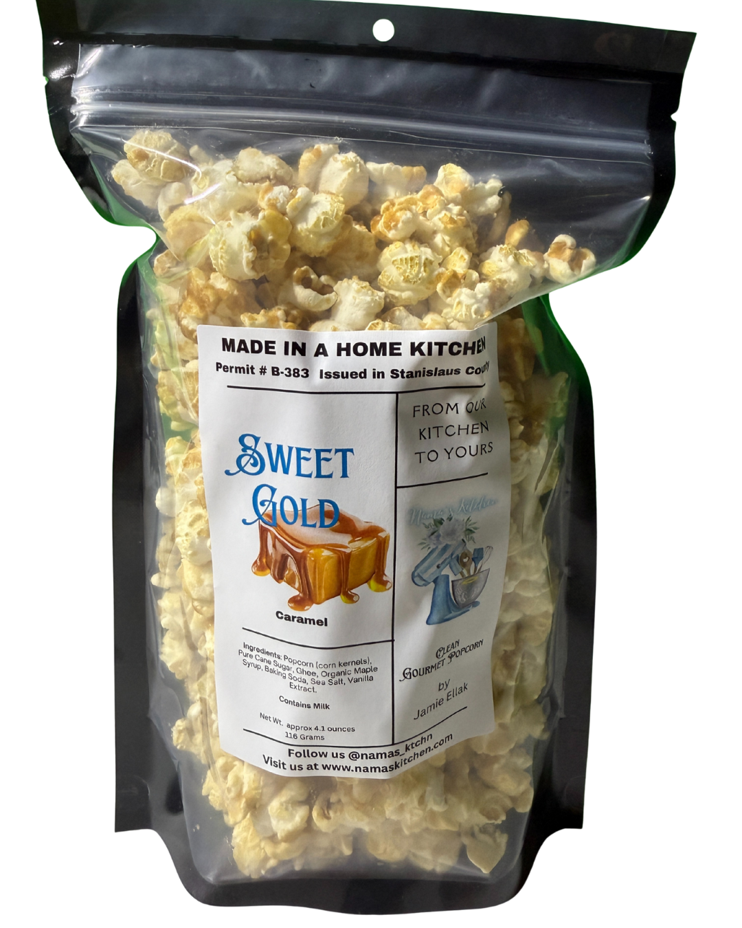 Ingredients: Popcorn (corn kernels), Pure Cane Sugar, Ghee, Organic Maple Syrup, Baking Soda, Sea Salt, Vanilla Extract.